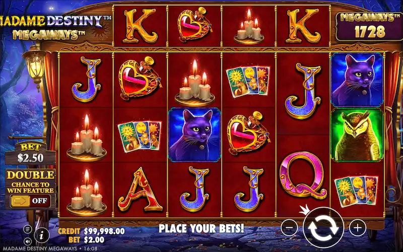 Madame Destiny Megaways uses the Megaways engine, offering up to 200,704 ways to win on a dynamic 6-reel layout. The number of symbols per reel changes with each spin, resulting in a constantly shifting number of paylines. Symbols include mystical icons such as the tarot card reader, crystal balls, cats, potions, and standard card values A, K, Q, and J, all designed to complement the magical theme. High-value symbols, like Madame Destiny herself and the crystal ball, can trigger substantial payouts, while lower-value symbols provide more frequent wins to maintain engagement throughout gameplay.