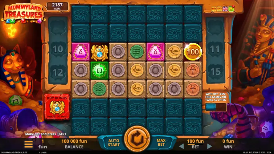 The theme of Mummyland Treasures is rooted in the timeless fascination with Ancient Egypt, drawing players into a world of pyramids, pharaohs, cursed tombs, and hidden treasures. The visual design is rich with Egyptian symbolism, featuring scarabs, ankhs, gemstones, and hieroglyphic artifacts that immediately establish the atmosphere of exploration and mystery. The backdrop resembles a dimly lit tomb chamber filled with ancient relics, reinforcing the feeling of being on a treasure hunt deep underground.